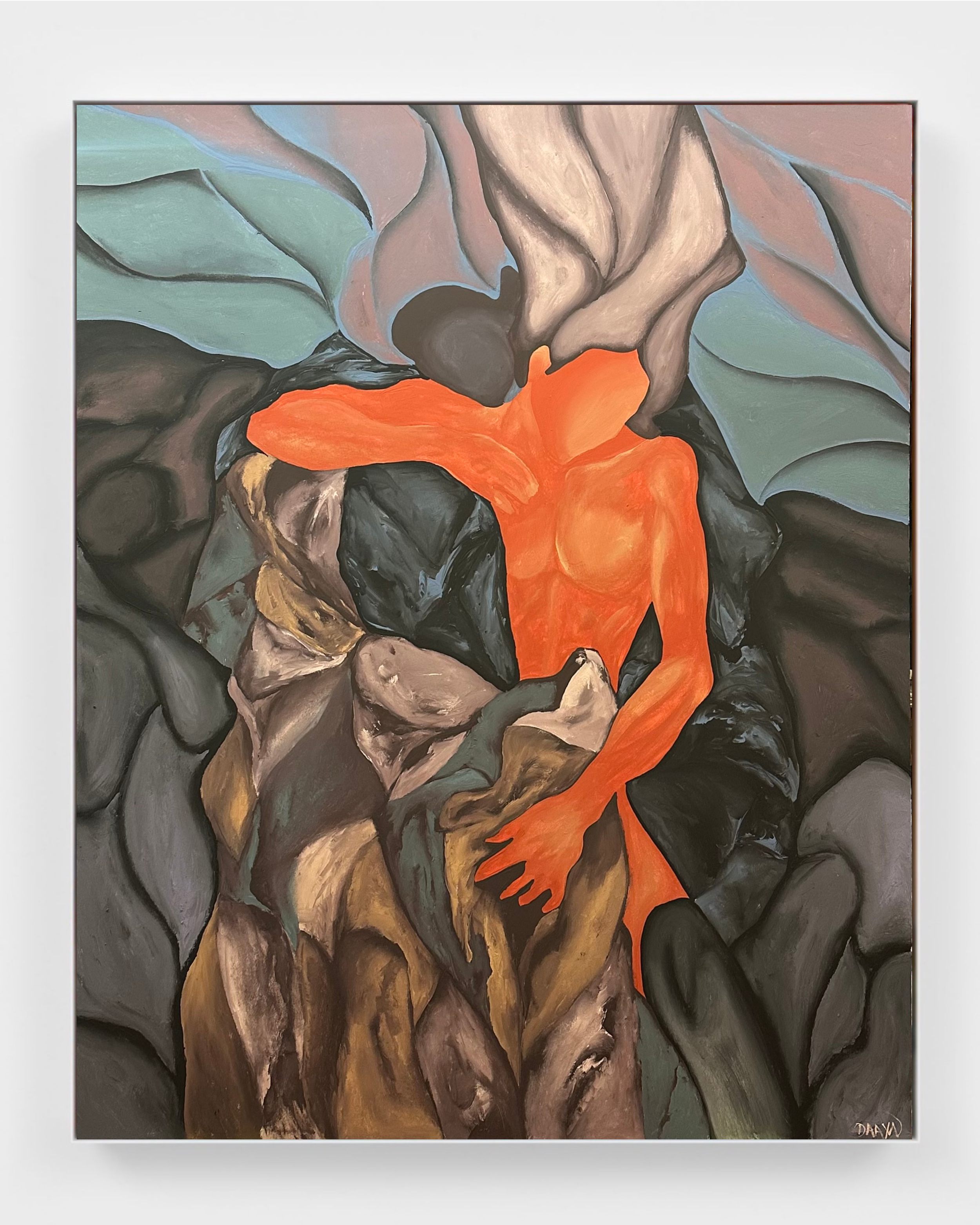 In this large-scale composition, the human figure is treated not as a stable identity but as a shifting, fractured presence. Five bodies occupy the same compressed space, merging and dissolving into one another until their boundaries become uncertain. Flesh, shadow, and drapery intermingle, making it difficult to determine where one body ends and another begins.