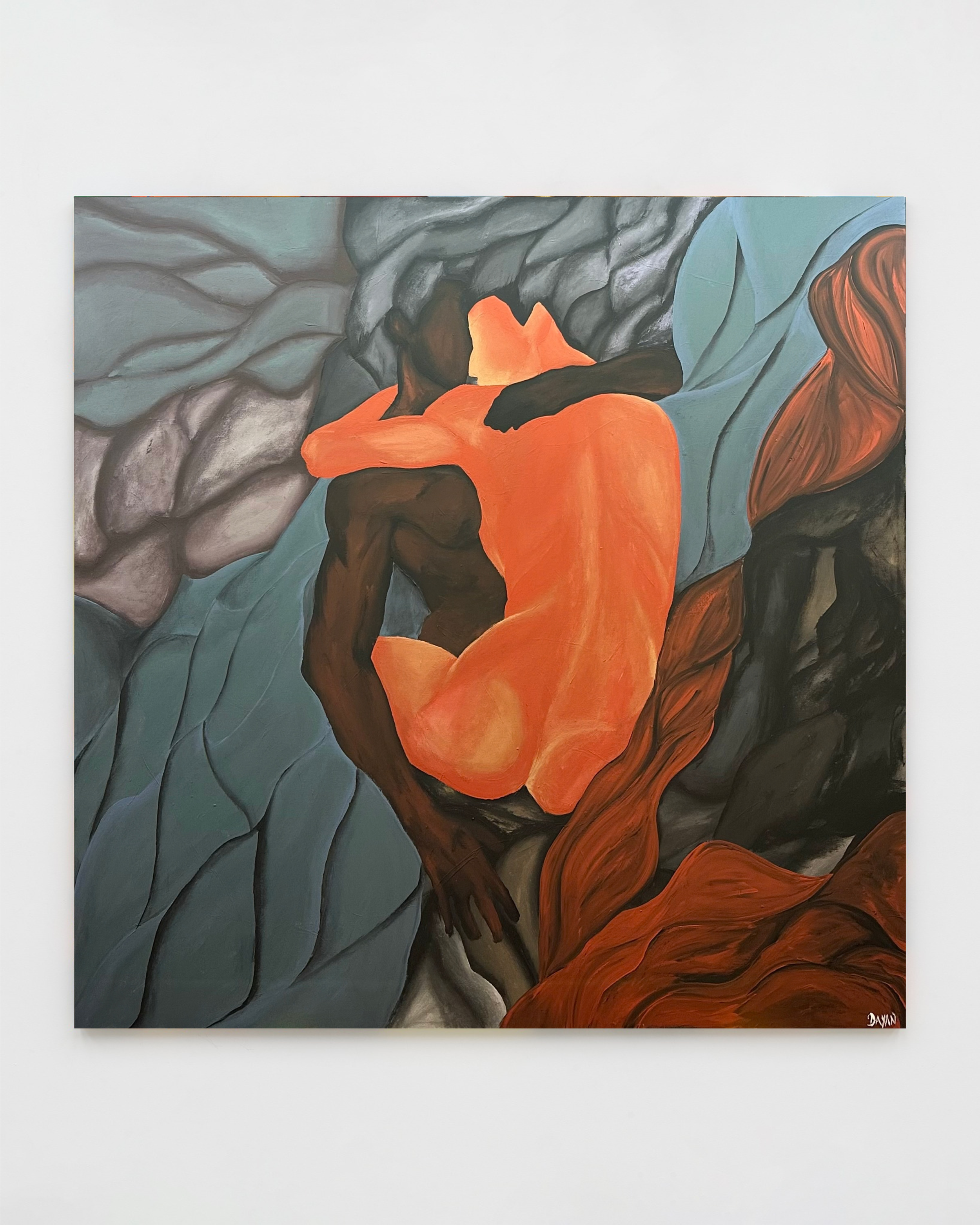 The square format intensifies the sense of containment, transforming flesh into terrain and intimacy into weight.