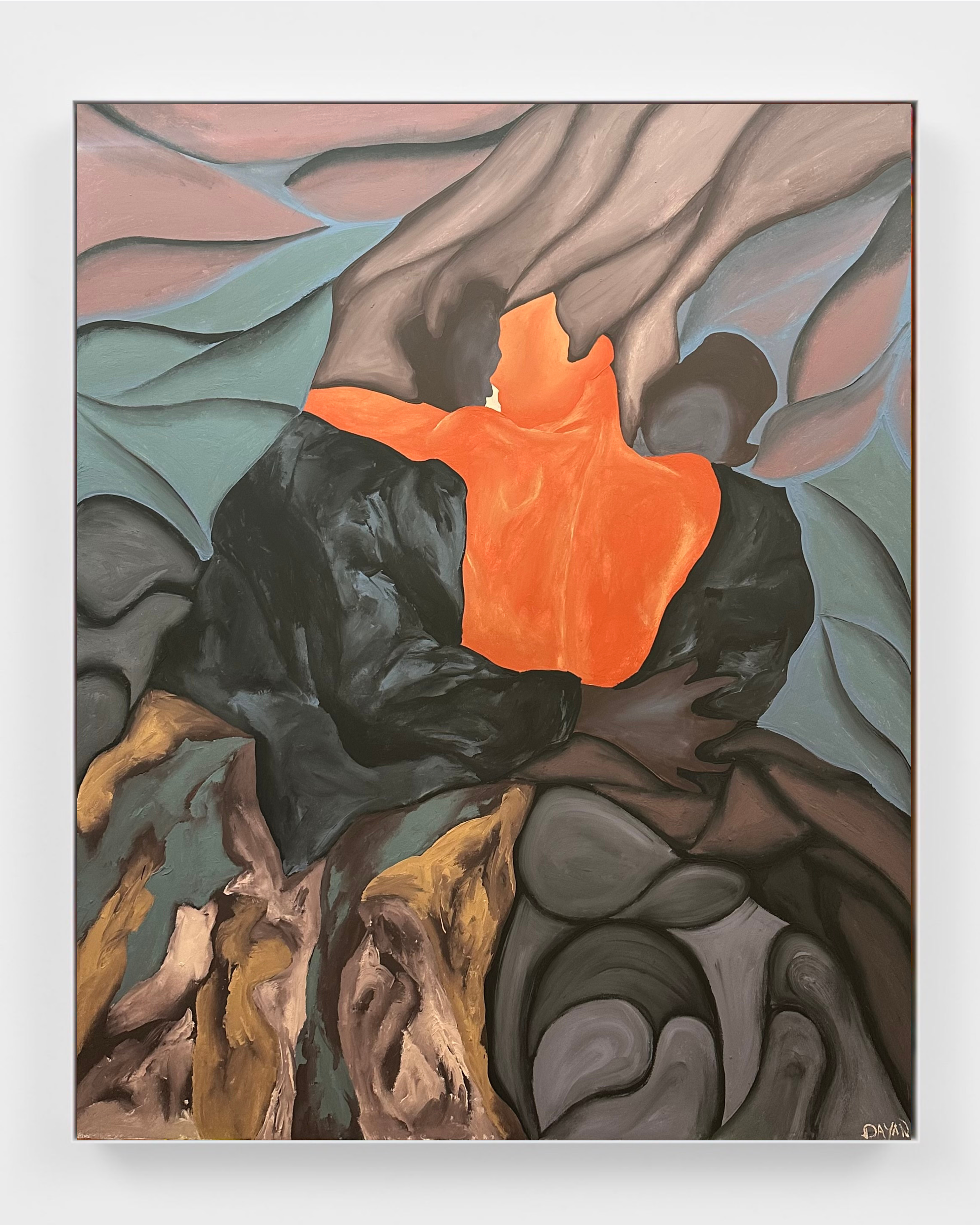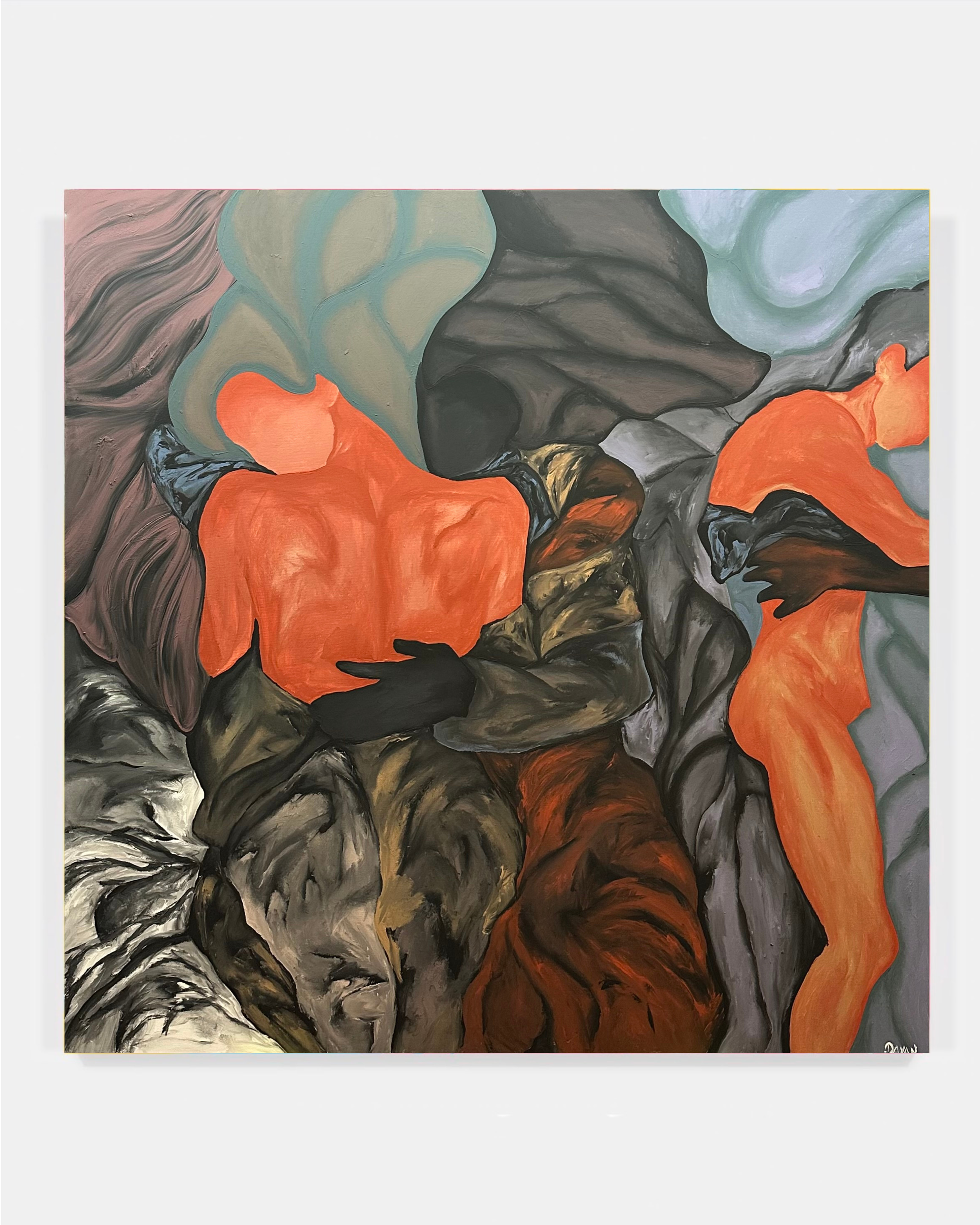 Rather than staging a narrative between separate individuals, Nazari constructs a psychological field in which multiple states of the self coexist simultaneously. The square format intensifies this sense of pressure and proximity, eliminating empty space and forcing the figures into a dense, almost claustrophobic mass. The result is less an image of interaction than one of accumulation — bodies as sediment, layered with memory and time.